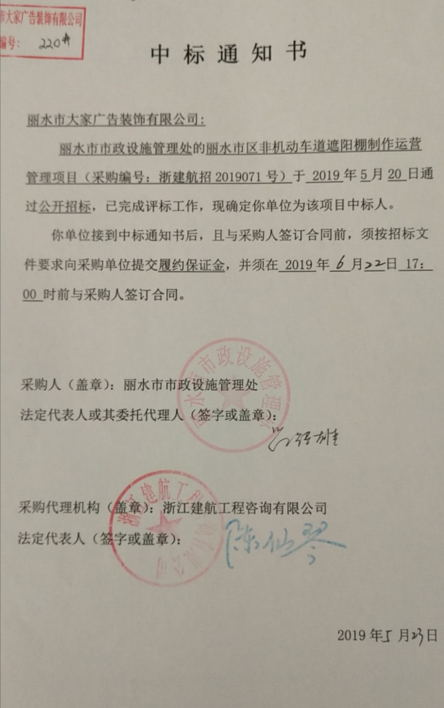 祝賀公司通過競標(biāo)喜獲麗水市蓮都區(qū)非機(jī)動車道遮陽棚廣告經(jīng)營權(quán)項目